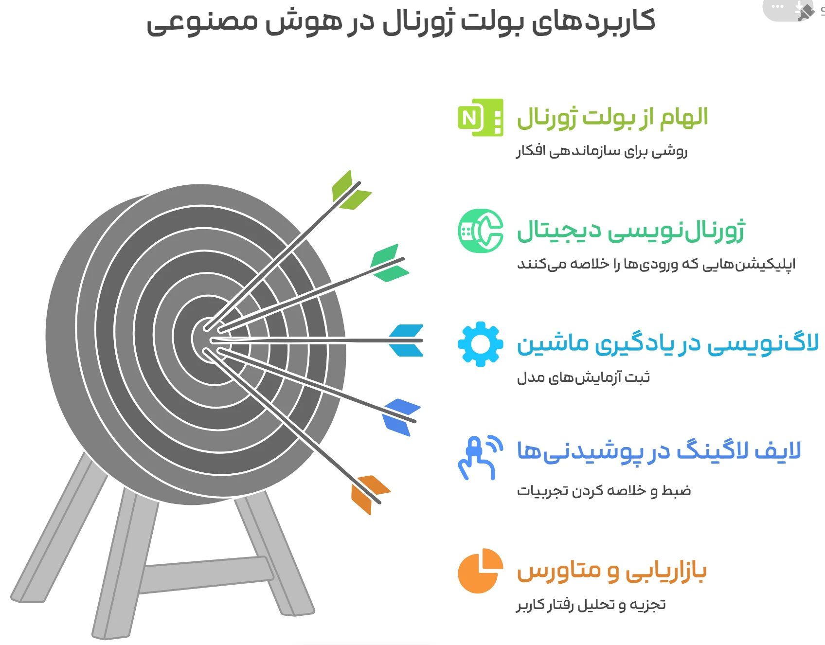 اپلیکیشن‌های ژورنال (Apple Journal, Day One) خیلی از اپلیکیشن‌ها دقیقا از همین منطق استفاده می‌کنند ساختار فکری بولت ژورنال—ثبت خلاصه، مرتب‌سازی موضوعی، مرور مستمر—با الگوریتم‌های امروزی هوش مصنوعی بسیار هماهنگ است